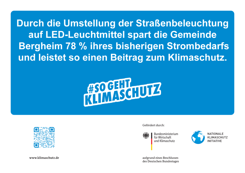 Die Gemeinde Bergheim rüstet im Jahr 2024 durch die Firma Bayernwerk alle Straßenleuchten auf LED-Leuchtmittel um. Ziel ist die Reduzierung des Strombedarfs und die Senkung der Treibhausemissionen. Hierfür erhält die Gemeinde unter anderem Fördermittel des Bundes über die Kommunalrichtlinie, Förderkennzeichen 67K24299 (www.klimaschutz.de/kommunalrichtlinie).